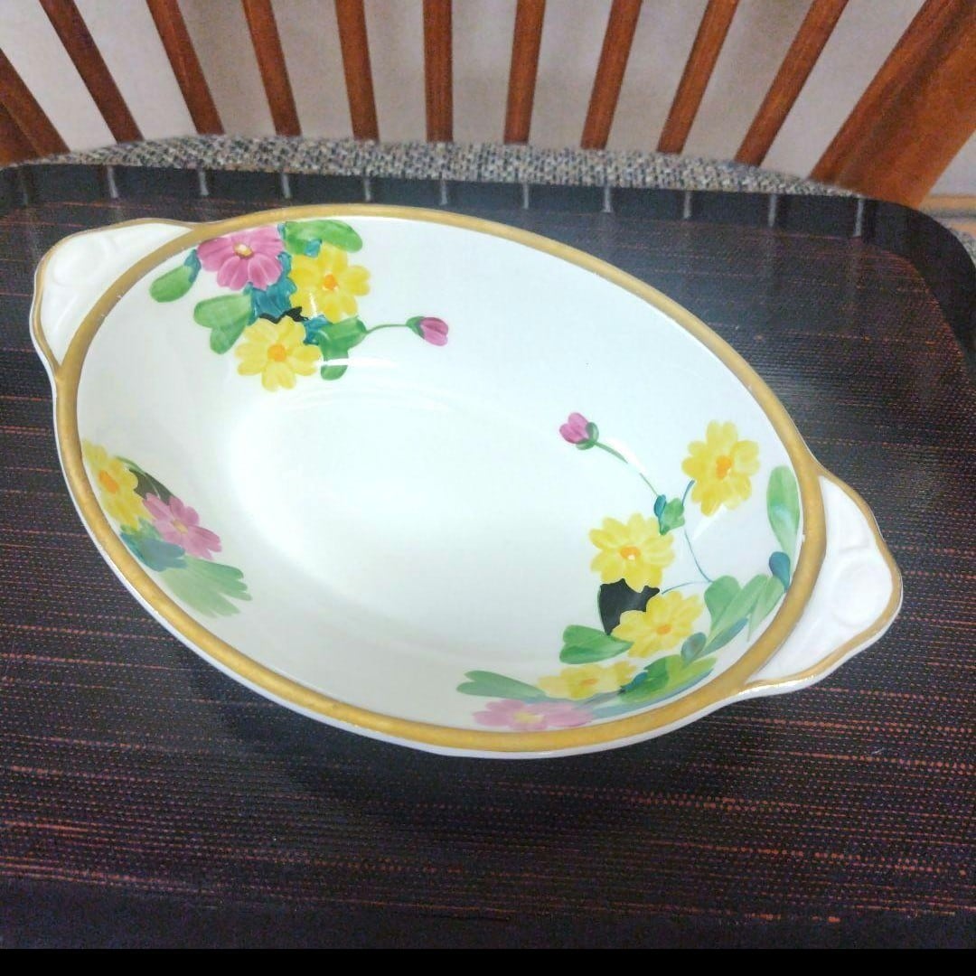 英国陶芸家(兼デザイナー)のスージークーパーの作品、グレイ社時代の美しいフローラル柄の長径約25cmの大きめのサービング・ディッシュです。縁の金彩も剥げておらず、貫入もない素晴らしいコンディションです。