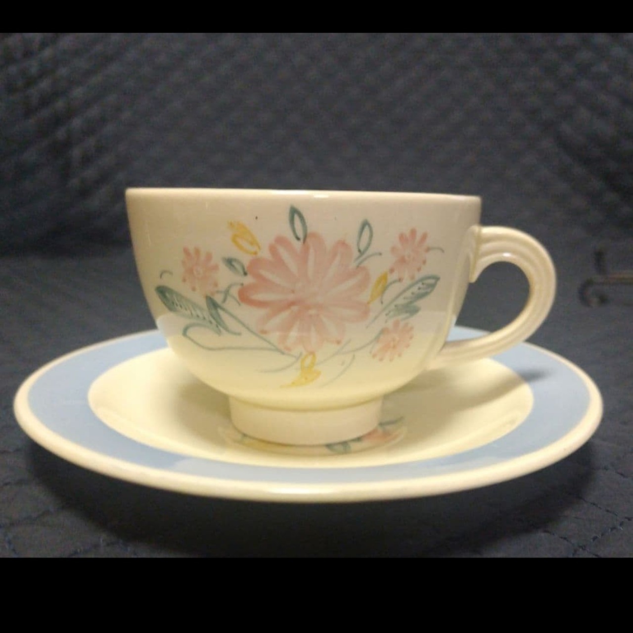 カップ・ソーサーに、可憐な花柄がデザインされ、カップ内面とソーサーの外周は綺麗な淡いブルーがあしらわれていて、気品漂う素敵な作品です。