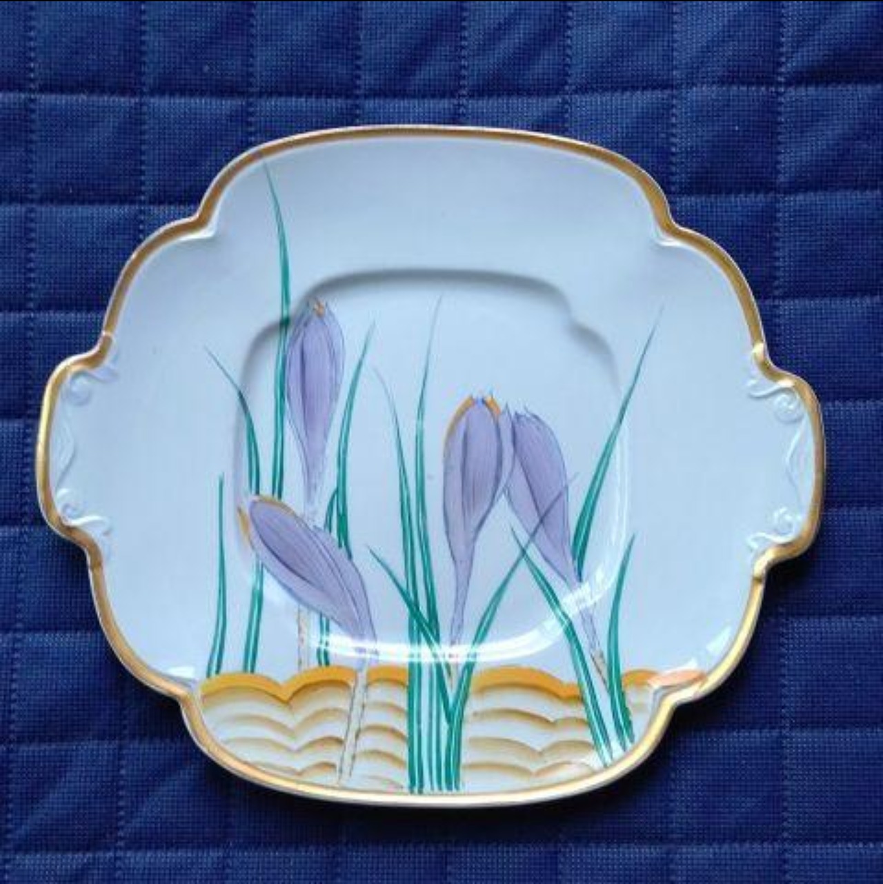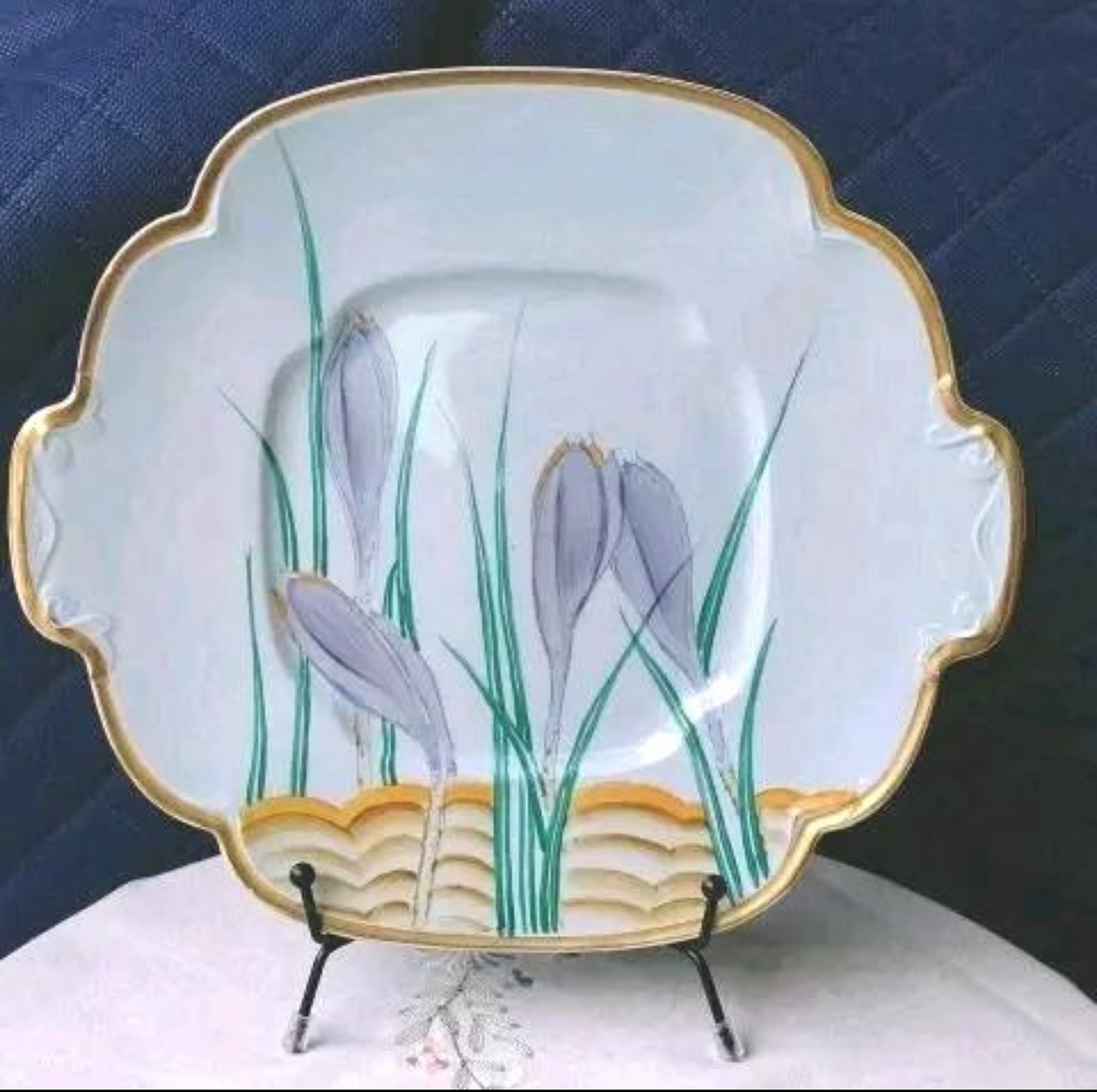 プレートの淵には金彩が施されていて、ベースのブルーに「金と紫」のコントラストが印象的な、素晴らしい作品です。