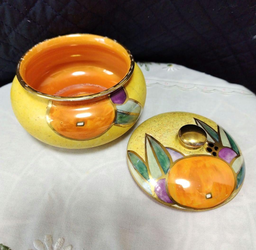 英国の陶芸家(兼デザイナー)スージークーパーの作品、1926年頃作製の非常に珍しい「GLORIALUSTRE」の蓋付きの小さなポットです。