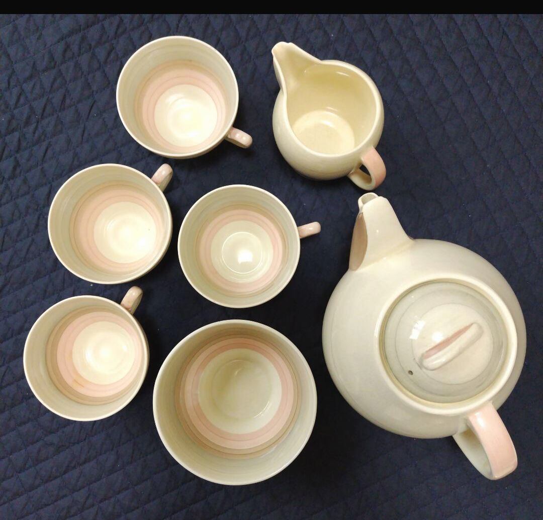 英国陶芸家(兼デザイナー)スージークーパーの作品、彼女の代表的なモチーフであるケストレルシェイプ、モチーフ「ウエディングリング」の15点ティーセットです。