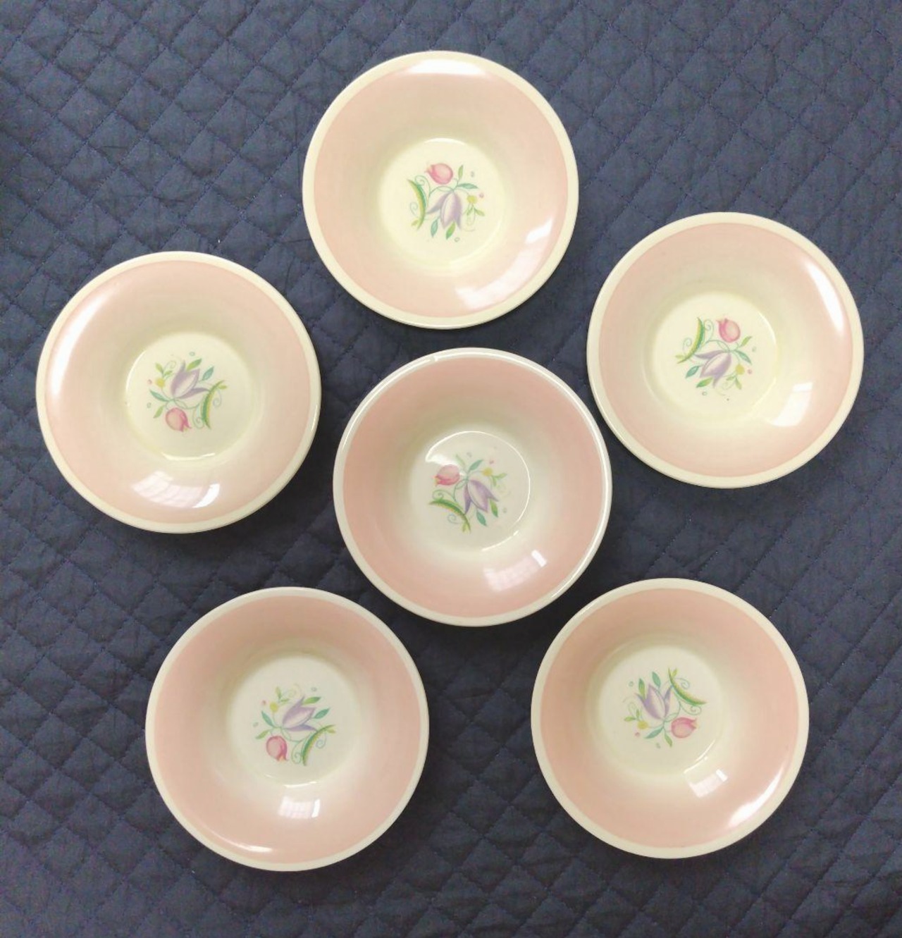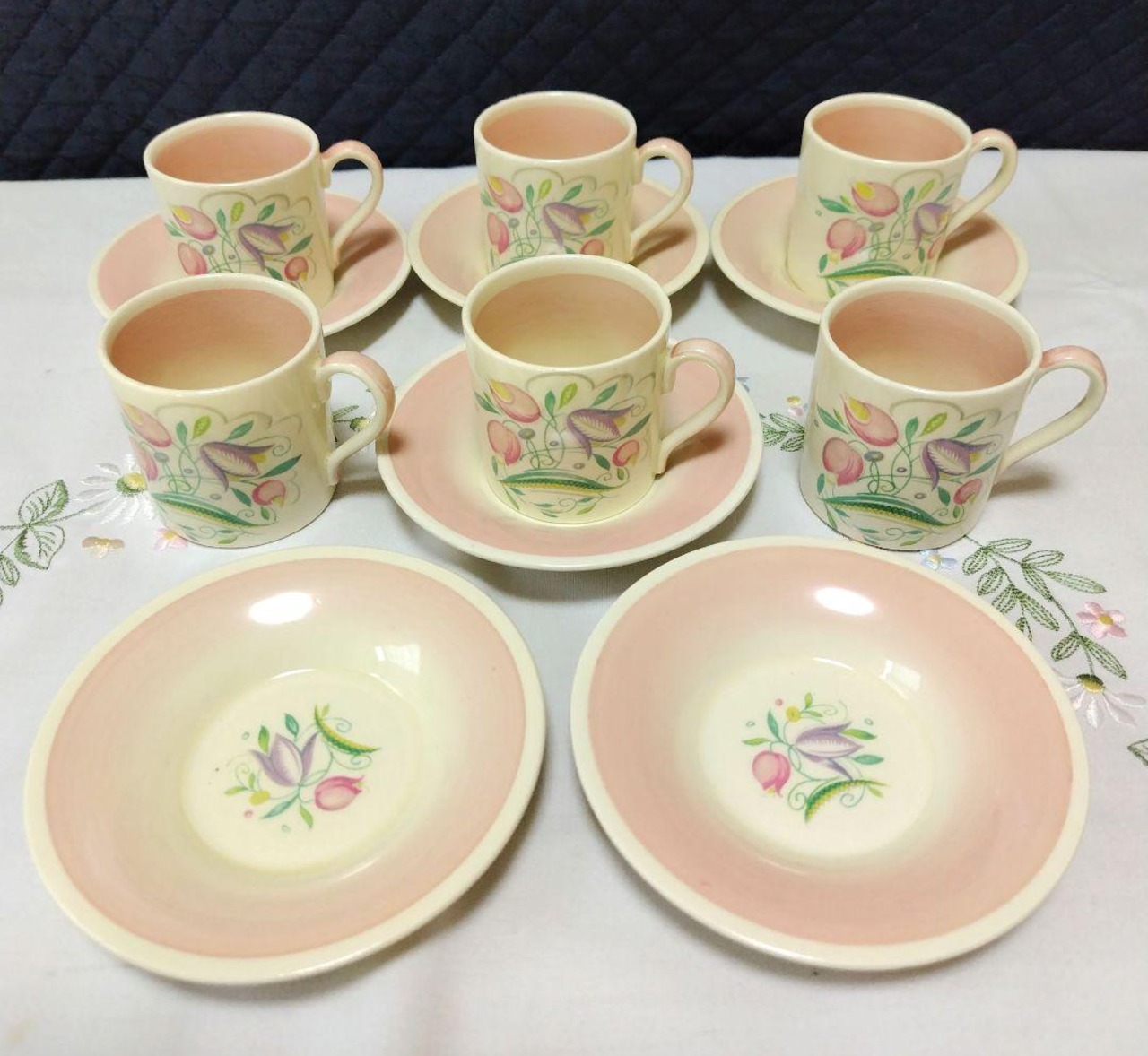 英国陶芸家スージークーパーのピンク「ドレスデンスプレイ」カップ&ソーサー6客セットです。