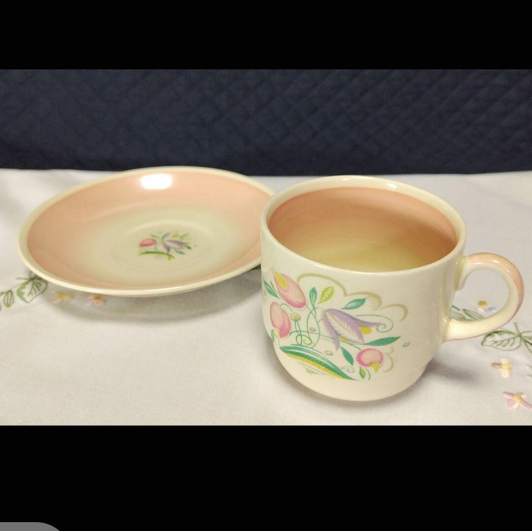 英国陶芸家スージークーパーのピンクの「ドレスデンスプレイ」カップ&ソーサー1客で、デミよりも大きめのコーヒーカッブです。