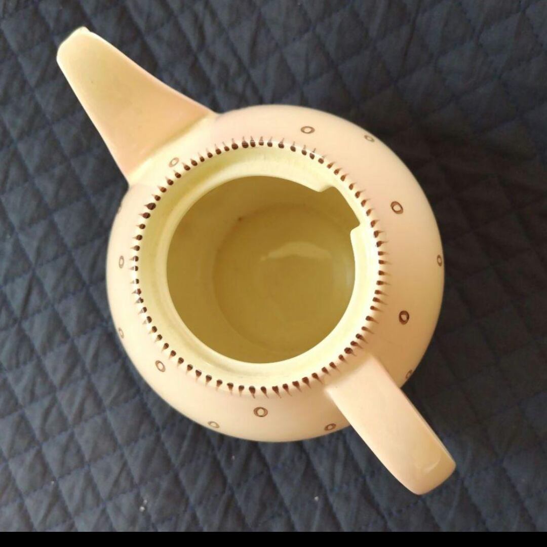 英国陶芸家のスージークーパーの作品、小さなサークルがリズミカルに配され、淵にステッチが施されているラブリーなモチーフで、丸形のケストレルポットとシュガーボトル、ミルクジャグの3点セットです。